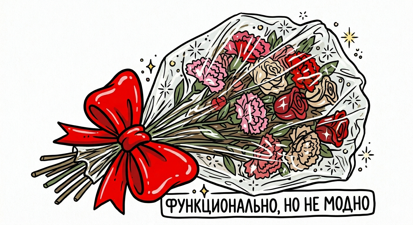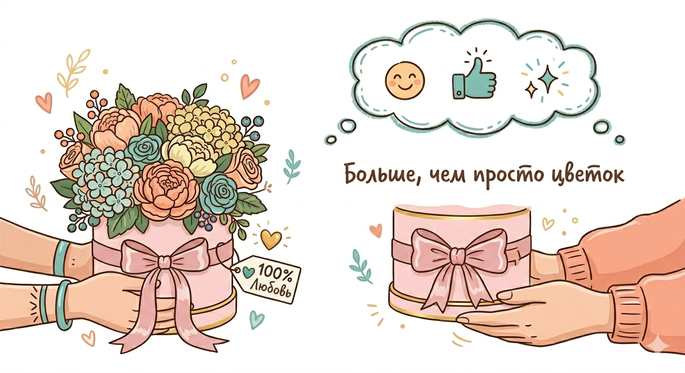 - Эмоциональный якорь: Упаковка говорит о том, что даритель потратил время. Что он не просто схватил первый попавшийся веник у метро, а выбрал концепцию. Это сигнализирует о глубоком уважении и заботе.