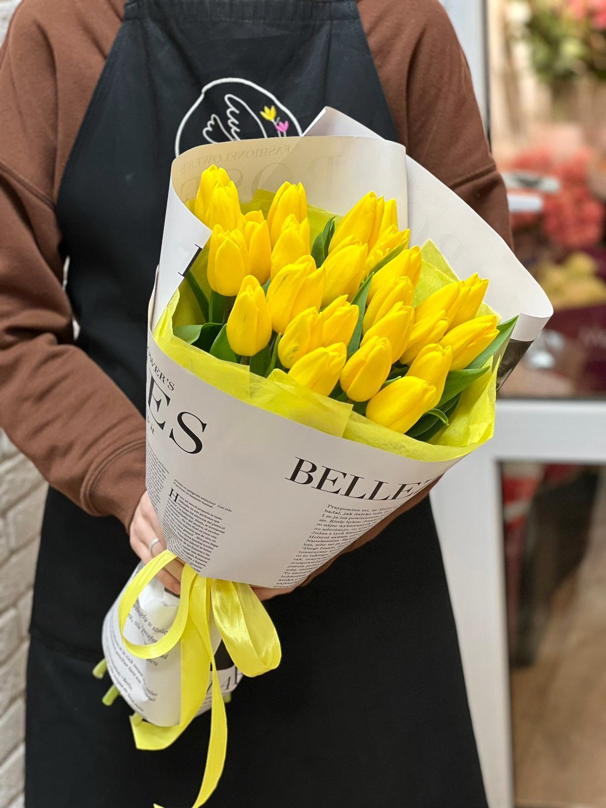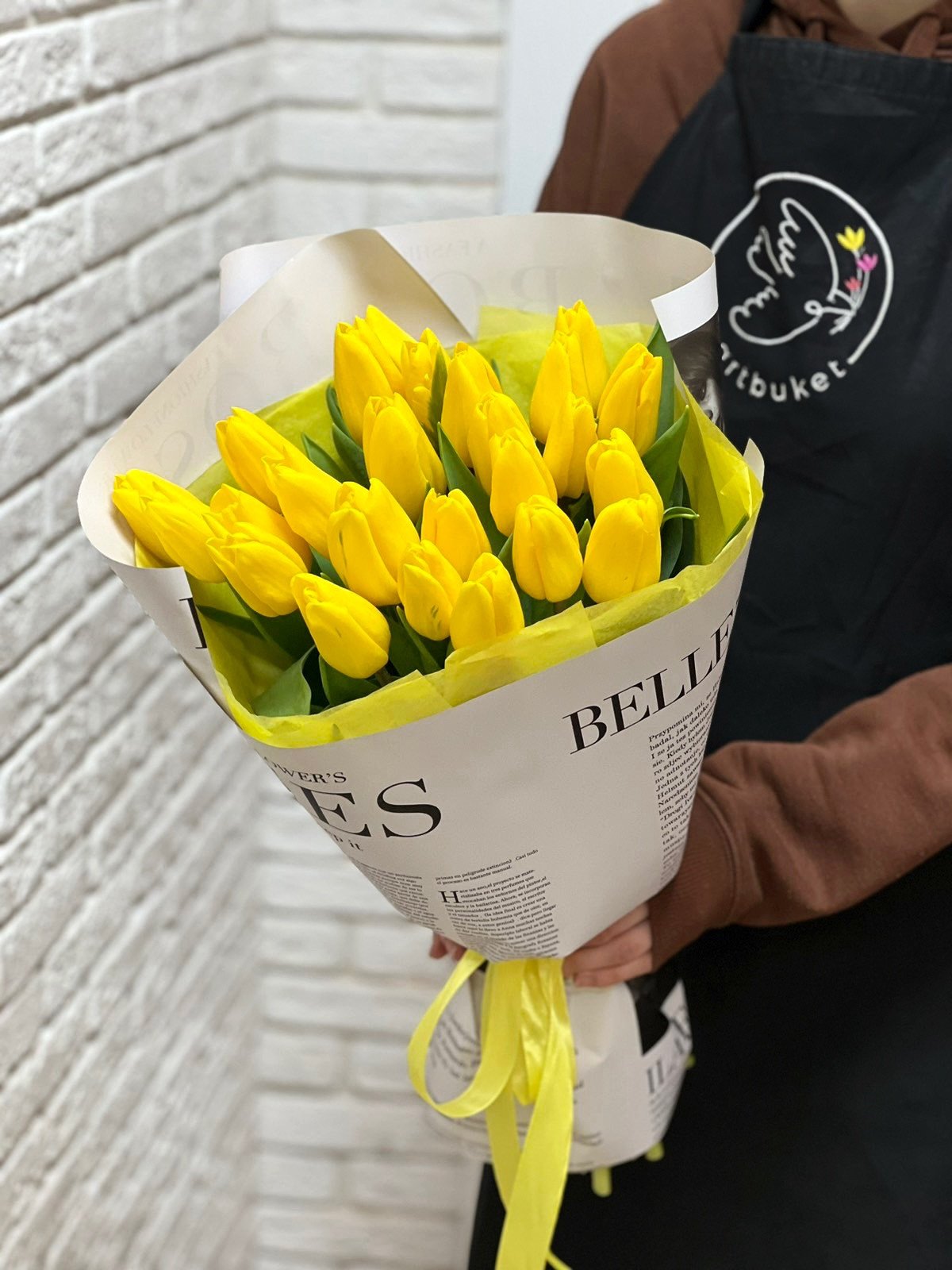Букет из 25 желтых тюльпанов в оформлении