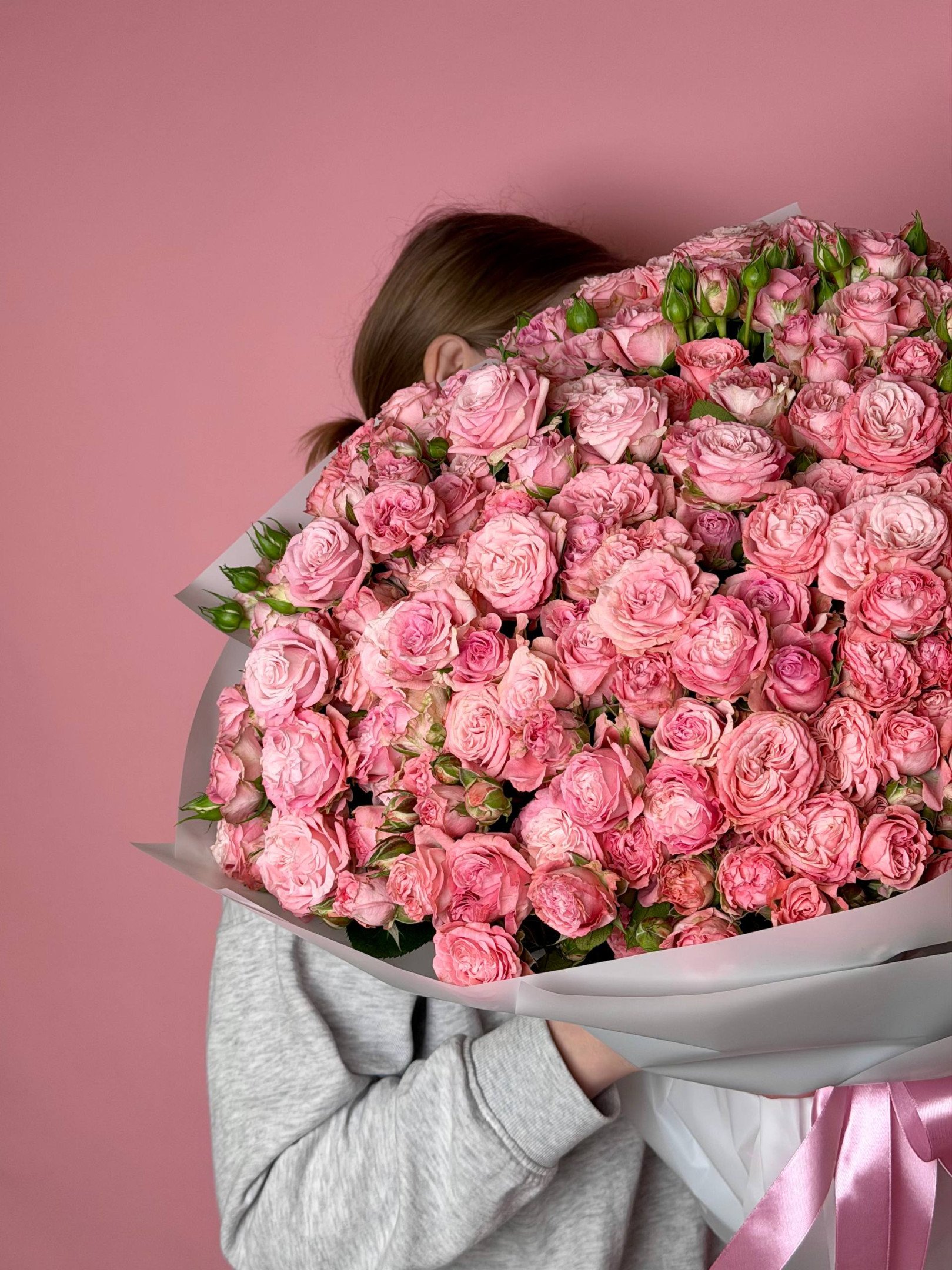Букет из 51 кустовой пионовидной розы «Мадам Бомбастик» в оформлении