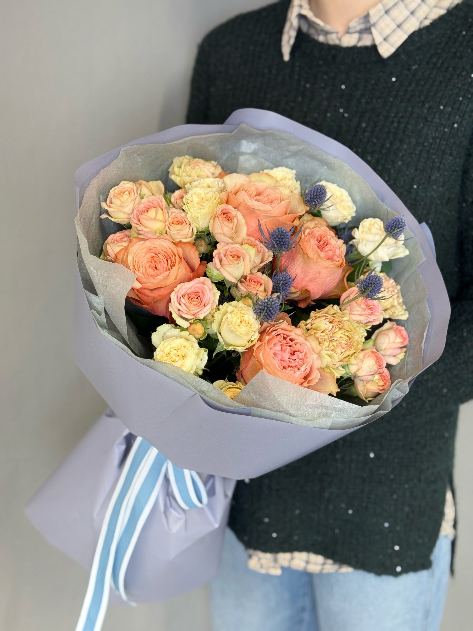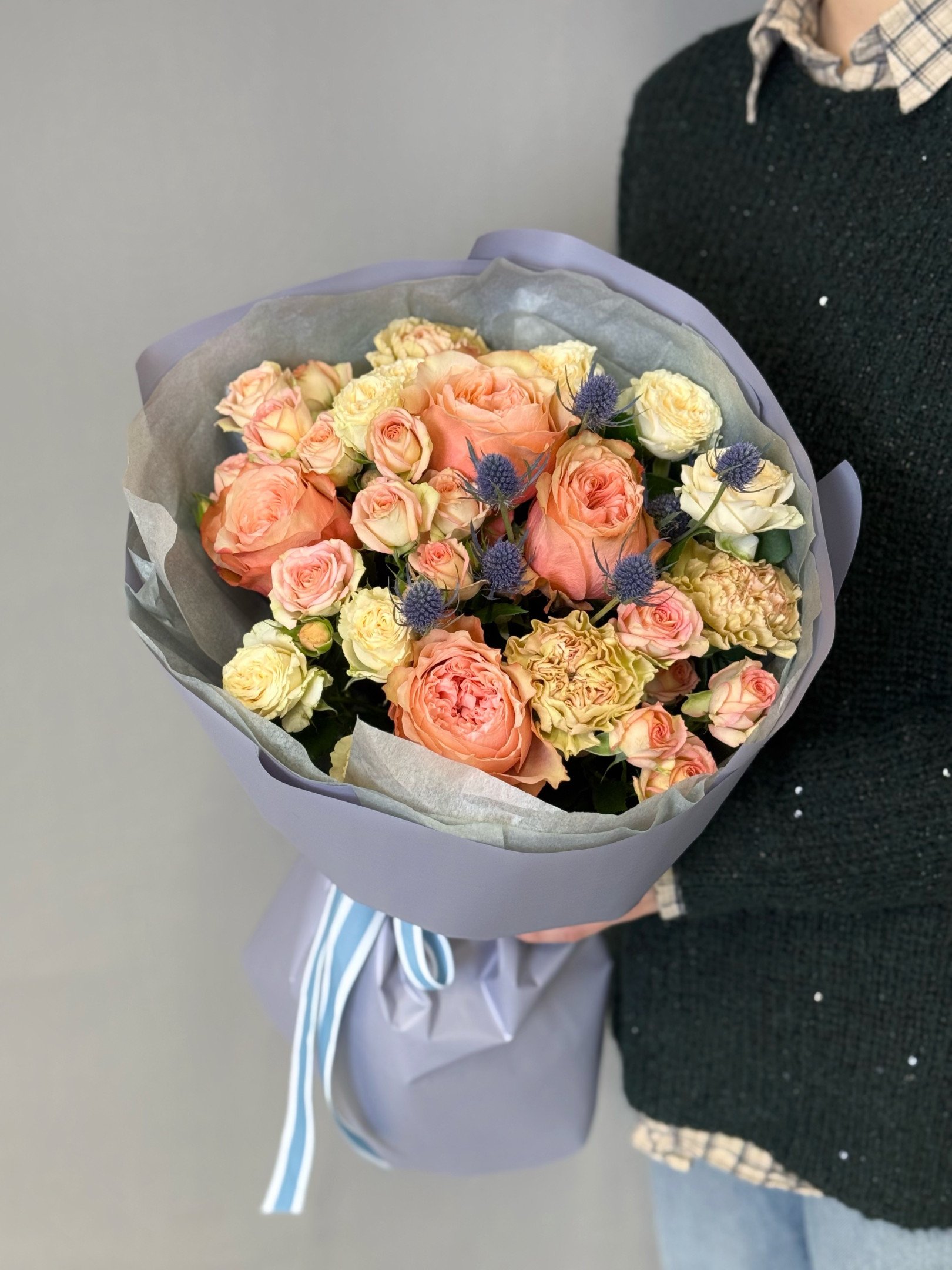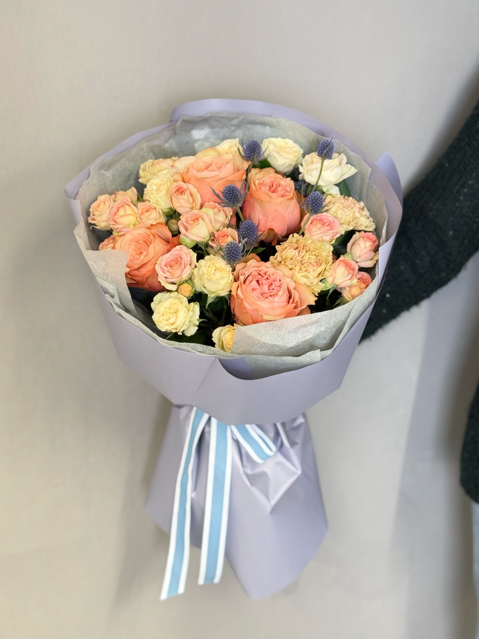 В случае отсутствия в наших магазинах цветов, входящих в состав букета, мы предложим вам заменить их на равные по стоимости либо проконсультируем по подбору другого букета.